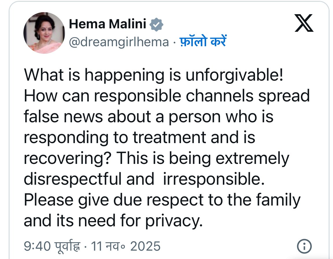 हेमा मालिनी ने भी ट्वीट कर लिखा कि ऐसे झूठे समाचार फैलाना असम्मानजनक और गैर-जिम्मेदाराना है। उन्होंने कहा कि धर्मेंद्र इलाज पर अच्छी प्रतिक्रिया दे रहे हैं और स्वस्थ हो रहे हैं। उन्होंने फैंस और मीडिया से परिवार की निजता का सम्मान करने की अपील की।