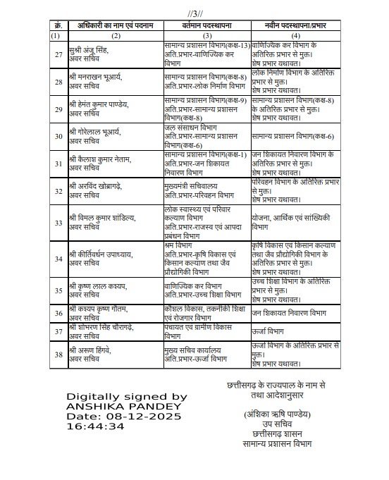 रायपुर, 08 दिसंबर। छत्तीसगढ़ सरकार के सामान्य प्रशासन विभाग (GAD) ने सोमवार को बड़ा प्रशासनिक फेरबदल करते हुए राज्य प्रशासनिक सेवा और सचिवालय सेवा के कुल 38 अधिकारियों की पदस्थापना में बदलाव किया है। यह आदेश तत्काल प्रभाव से लागू हो गया है और सभी अधिकारियों को अपनी नई पदस्थापना में कार्यभार ग्रहण करने के निर्देश दिए गए हैं।