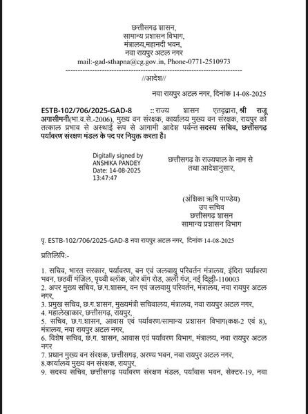 रायपुर। छत्तीसगढ़ शासन ने भारतीय वन सेवा (IFS) के अधिकारी एवं मुख्य वन संरक्षक राजू अगासीमनी को तत्काल प्रभाव से छत्तीसगढ़ पर्यावरण संरक्षण मंडल का सदस्य सचिव नियुक्त किया है। सामान्य प्रशासन विभाग ने यह आदेश 14 अगस्त 2025 को जारी किया। आदेश के अनुसार, वे आगामी आदेश तक इस पद का कार्यभार संभालेंगे।