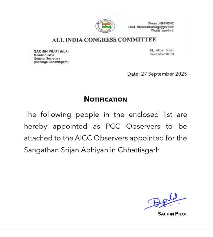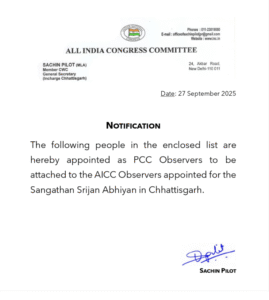 रायपुर, 28 सितंबर। प्रदेश कांग्रेस ने जिला अध्यक्षों के चयन के लिए विधायकों, पूर्व मंत्रियों और प्रदेश पदाधिकारियों को पर्यवेक्षक के रूप में नियुक्त किया है। ये पर्यवेक्षक एआईसीसी द्वारा नियुक्त बाहरी पर्यवेक्षकों का सहयोग करेंगे।