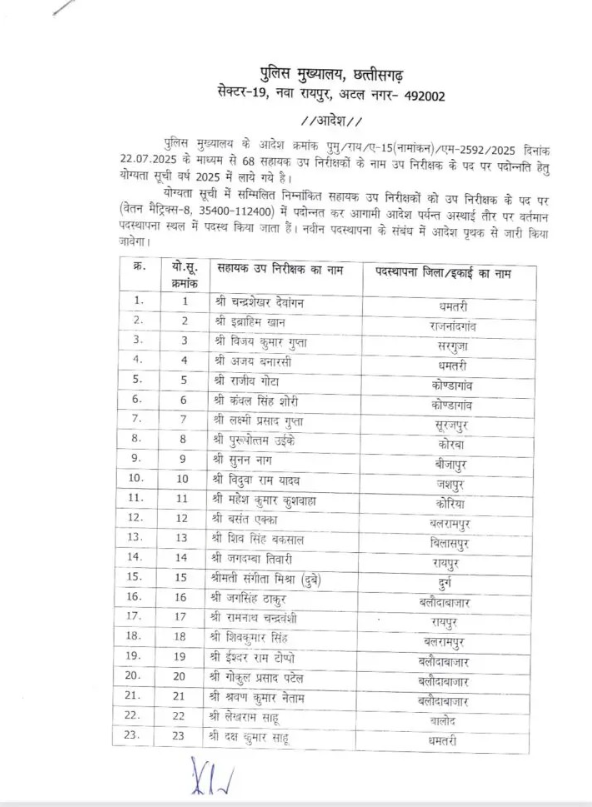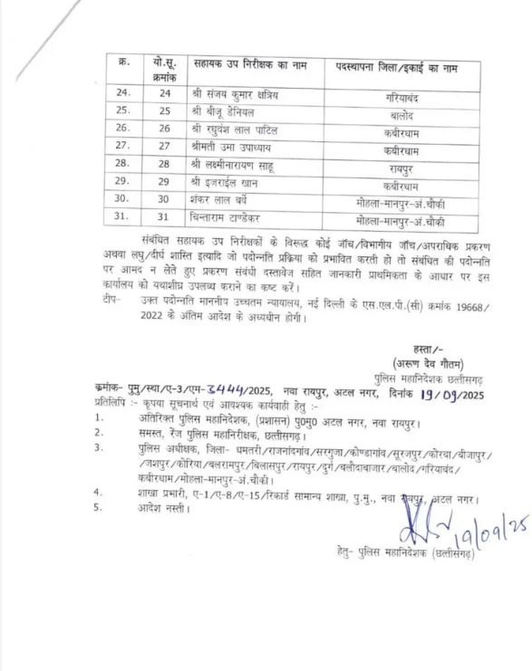 रायपुर, 20 सितंबर। छत्तीसगढ़ पुलिस महकमे में बड़ा बदलाव किया गया है। डीजीपी अरुणदेव गौतम ने राज्य के 31 सहायक उपनिरीक्षकों (ASI) को सब इंस्पेक्टर (SI) पदोन्नत करने का आदेश जारी किया है।