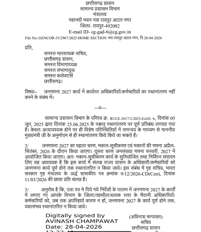 रायपुर। छत्तीसगढ़ सरकार ने कर्मचारियों और अधिकारियों के लिए बड़ा आदेश जारी कर दिया है। अब जनगणना 2027 से जुड़े कर्मचारियों का ट्रांसफर फिलहाल रोक दिया गया है।