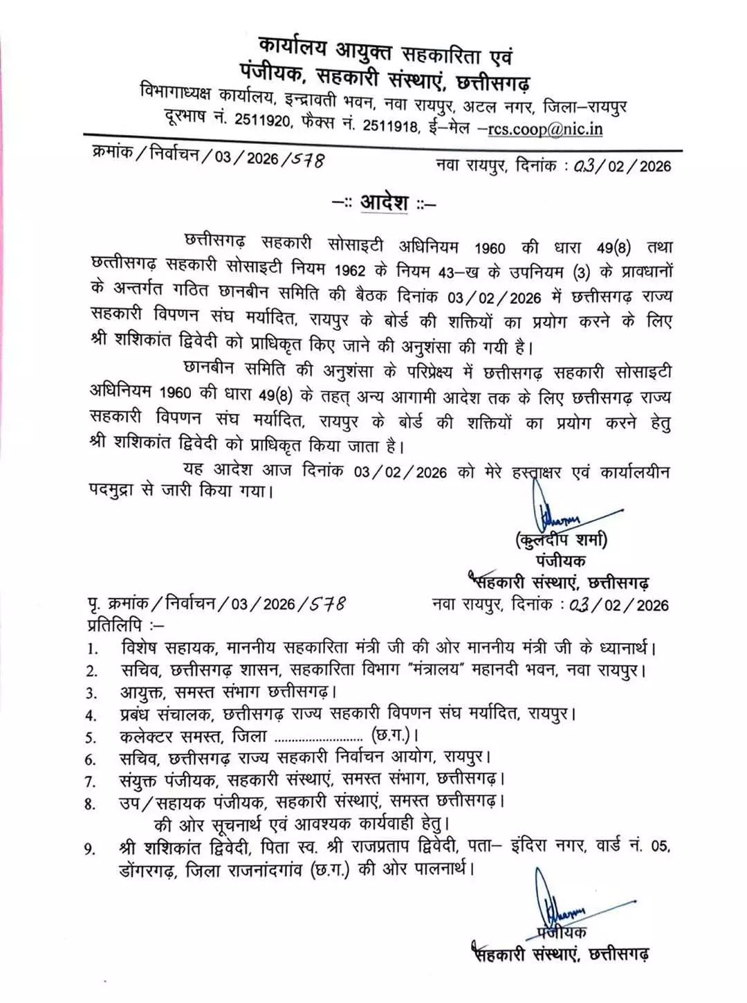 जारी आदेश में उल्लेख किया गया है कि छत्तीसगढ़ सहकारी सोसाइटी अधिनियम 1960 की धारा 49(8) तथा छत्तीसगढ़ सहकारी सोसाइटी नियम 1962 के नियम 43-ख के उपनियम (3) के तहत गठित छानबीन समिति की बैठक 3 फरवरी 2026 को आयोजित की गई थी। बैठक में छत्तीसगढ़ राज्य सहकारी विपणन संघ मर्यादित, रायपुर के बोर्ड की शक्तियों का प्रयोग करने के लिए शशिकांत द्विवेदी को प्राधिकृत किए जाने की अनुशंसा की गई।