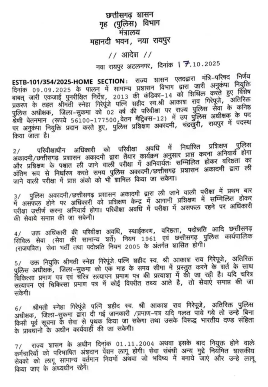 गौरतलब है कि एएसपी आकाश राव गिरपुन्जे की शहादत सुकमा जिले में नक्सली हमले के दौरान आईईडी ब्लास्ट में हुई थी। उनकी वीरता और बलिदान को याद करते हुए राज्य सरकार ने उनकी पत्नी स्नेहा गिरपुन्जे को पुलिस सेवा में शामिल करने का निर्णय लिया।