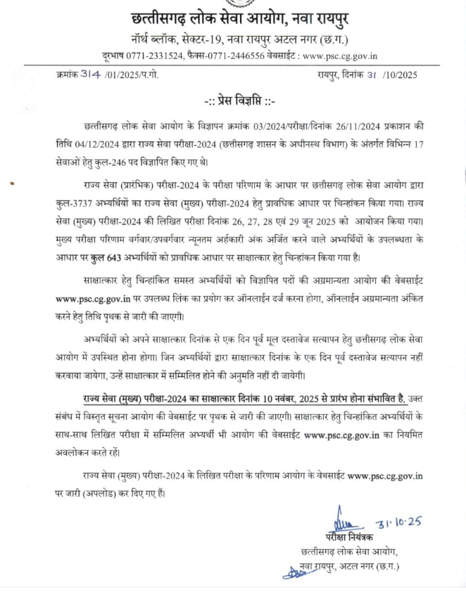 इंटरव्यू की प्रक्रिया 10 नवंबर से शुरू होकर 20 नवंबर 2025 तक चलेगी। चयनित उम्मीदवार CGPSC की आधिकारिक वेबसाइट psc.cg.gov.in पर अपना परिणाम देख सकते हैं।