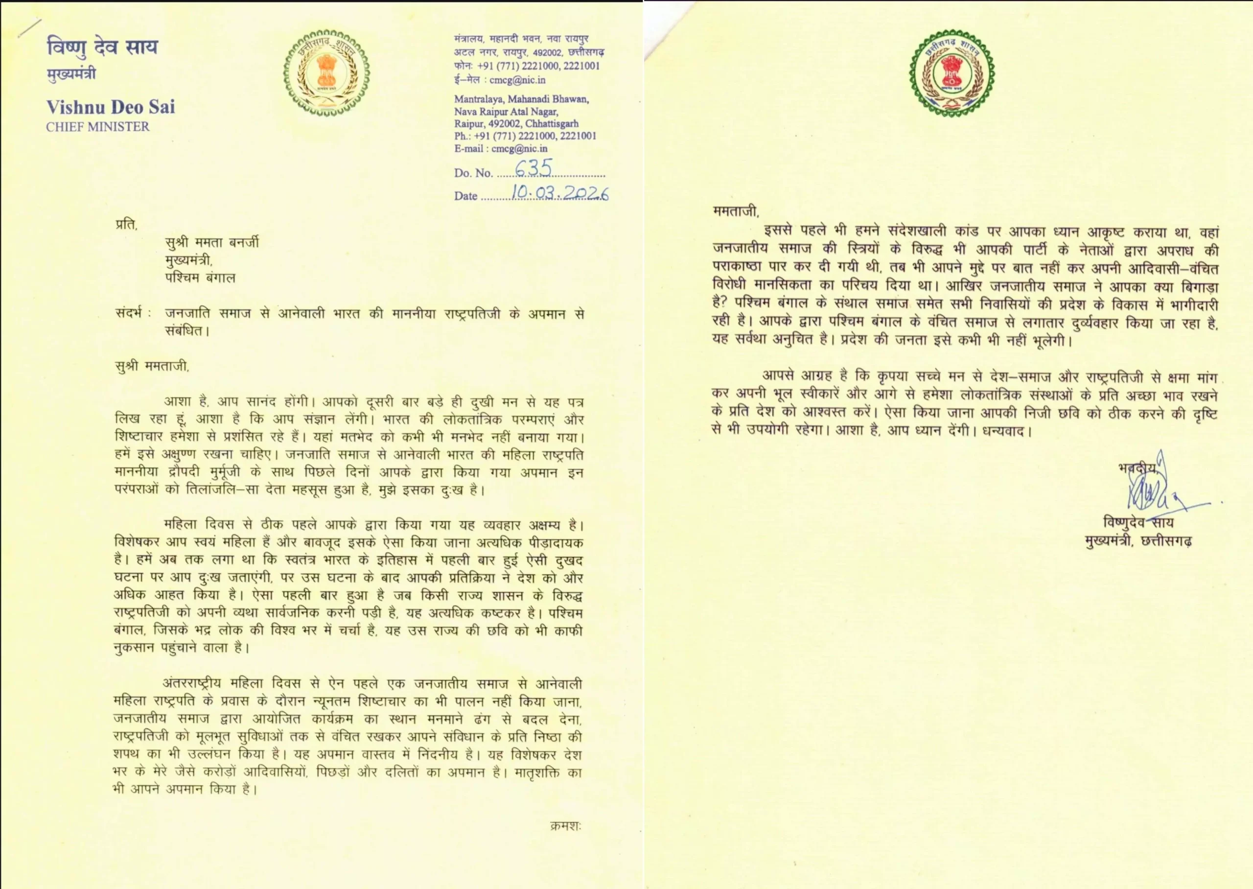 रायपुर। मुख्यमंत्री श्री विष्णु देव साय ने पश्चिम बंगाल की मुख्यमंत्री सुश्री ममता बनर्जी को कड़ा पत्र लिखकर भारत की माननीय राष्ट्रपति श्रीमती द्रौपदी मुर्मू के साथ हाल ही में हुए व्यवहार पर गहरी आपत्ति जताई है।