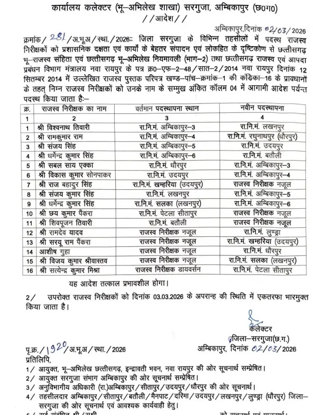 Chhattisgarh: Major administrative reshuffle in Surguja; 16 revenue inspectors transferred.