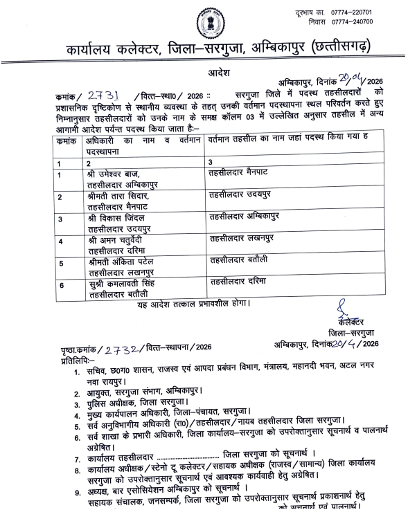 Chhattisgarh | सरगुजा में बड़ा प्रशासनिक फेरबदल… सभी तहसीलदारों के प्रभार बदले