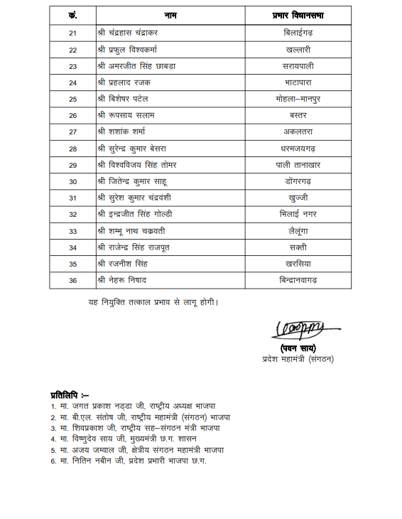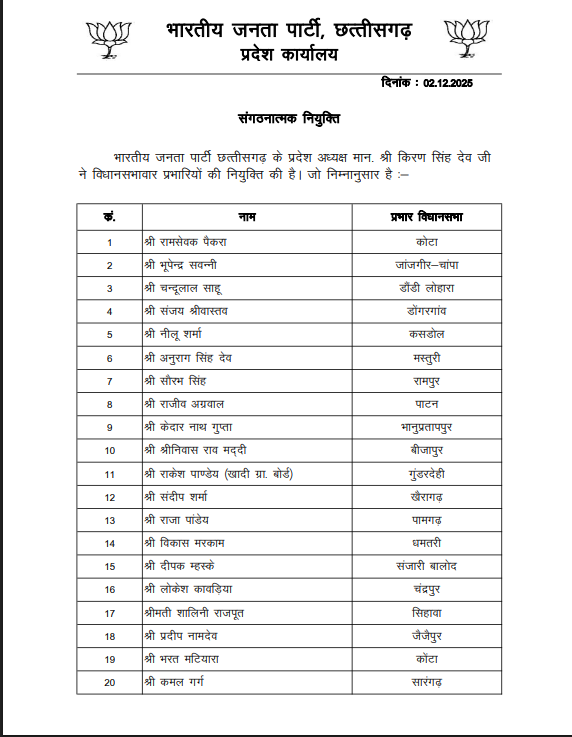 रायपुर। छत्तीसगढ़ भारतीय जनता पार्टी ने संगठनात्मक मजबूती के तहत 36 विधानसभा क्षेत्रों में नए विधानसभा प्रभारियों की नियुक्ति की है। यह नियुक्ति आदेश भाजपा प्रदेश अध्यक्ष किरण सिंह देव ने जारी किया है।