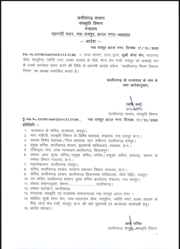 शासन द्वारा शुक्रवार, 17 अक्टूबर 2025 को जारी आदेश में कहा गया है कि मोना सेन अपने कार्यभार ग्रहण करने की तिथि से आगामी आदेश तक निगम का दायित्व संभालेंगी। आदेश संस्कृति विभाग की अपर सचिव रुचि शर्मा ने राज्यपाल के नाम से जारी किया है।