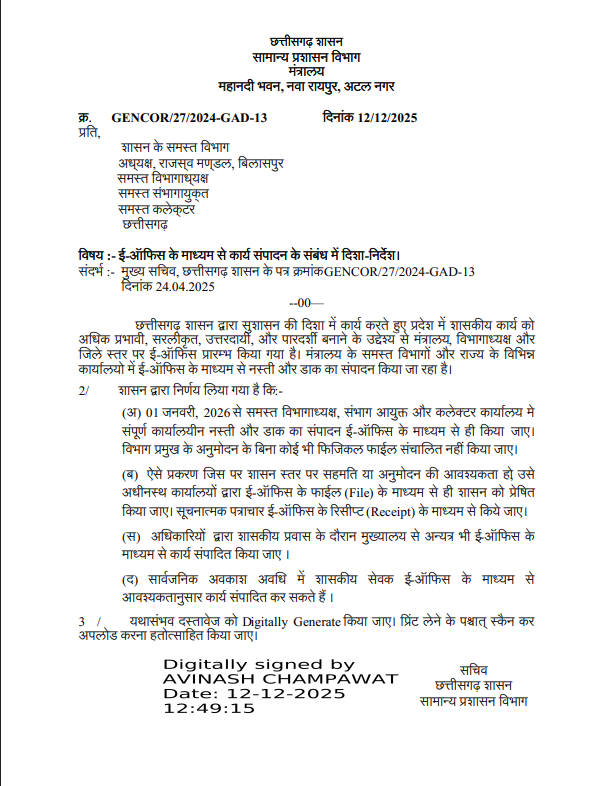 सरकार ने आदेश में कहा है कि 1 जनवरी 2026 से हर विभागाध्यक्ष, संभाग आयुक्त और कलेक्टर कार्यालय को फाइल संचालन सिर्फ और सिर्फ ई-ऑफिस में करना होगा। किसी भी स्थिति में फिजिकल फाइल नहीं बनाई जाएगी, जब तक कि विभाग प्रमुख खुद अनुमति न दें।
