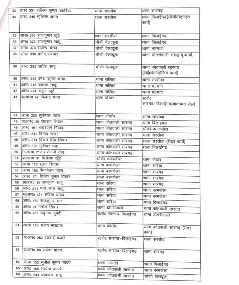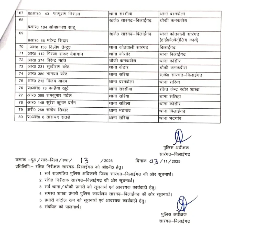 सारंगढ़-बिलाईगढ़। जिले में पुलिस विभाग में बड़ा प्रशासनिक बदलाव किया गया है। पुलिस अधीक्षक आञ्जनेय वार्ष्णेय ने सोमवार को 80 पुलिसकर्मियों के तबादले का आदेश जारी किया है। इसमें 16 प्रधान आरक्षक और 64 आरक्षक एवं महिला आरक्षक शामिल हैं।