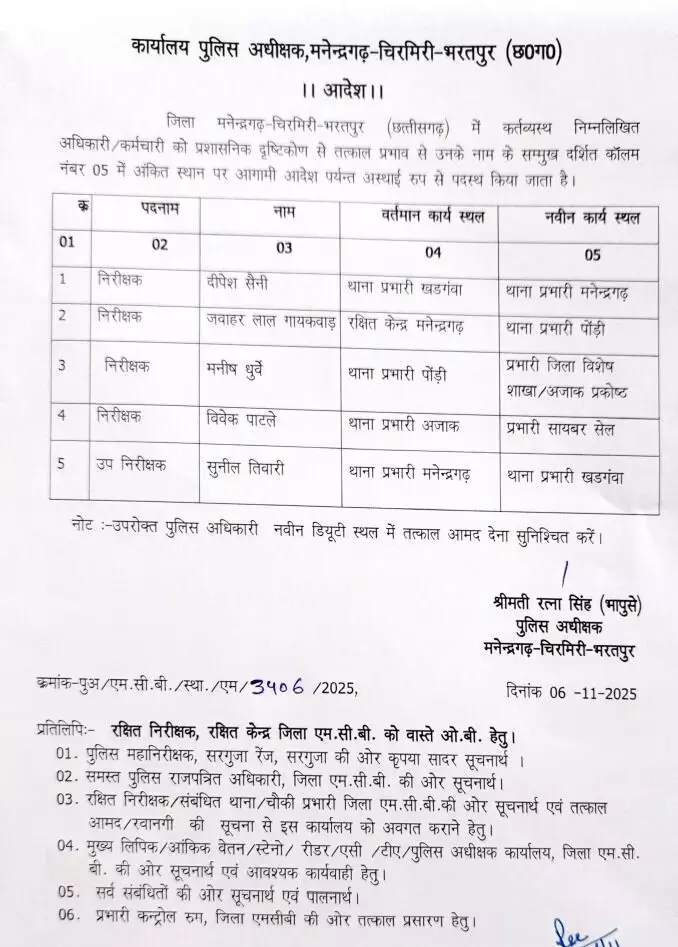 मनेंद्रगढ़, 6 नवंबर 2025। छत्तीसगढ़ के मनेंद्रगढ़-चिरमिरी-भरतपुर (MCB) जिले में पुलिस विभाग में बड़ा फेरबदल किया गया है। एसपी रत्ना सिंह ने कई थाना प्रभारियों के तबादले के आदेश जारी किए हैं। आदेश के तहत जिले के कई थानों में निरीक्षकों और उपनिरीक्षकों की नई पदस्थापना की गई है।