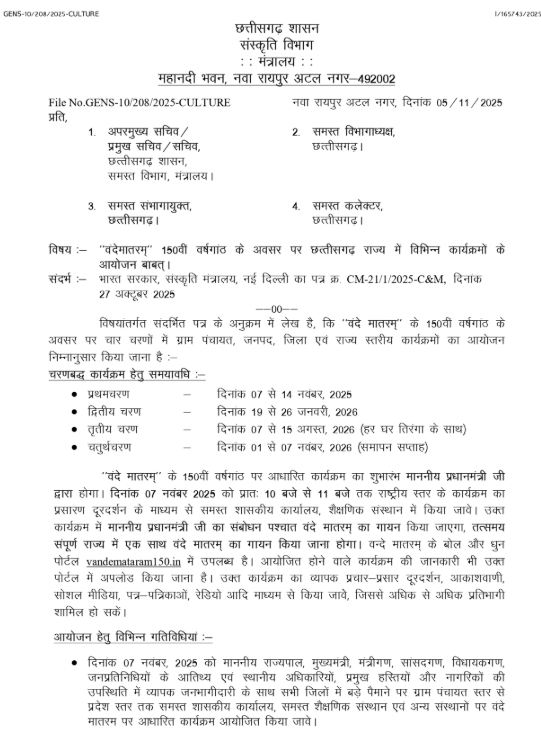 रायपुर, 5 नवंबर 2025। राष्ट्रगान वंदेमातरम की 150वीं वर्षगांठ को यादगार बनाने के लिए छत्तीसगढ़ में सालभर विशेष आयोजन किए जाएंगे। राज्य का संस्कृति विभाग इस अवसर पर चार चरणों में श्रृंखलाबद्ध समारोह आयोजित करेगा। यह आयोजन केंद्र सरकार के निर्देश पर 7 नवंबर से शुरू होकर अगले वर्ष नवंबर तक चलेगा।