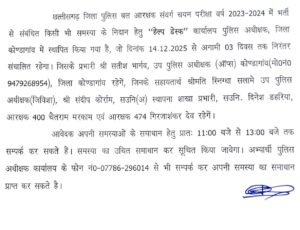 नीरज उपाध्याय/कोंडागांव:- छत्तीसगढ़ जिला पुलिस बल आरक्षक संवर्ग चयन परीक्षा वर्ष 2023-2024 में भर्ती से संबंधित किसी भी समस्या के निदान हेतु कोंडागांव एसपी पंकज चंद्रा के निर्देशानुसार एसपी ऑफिस में एक “हेल्प डेस्क” स्थापित किया गया है। यह हेल्प डेस्क दिनांक 14.12.2025 से अगामी 03 दिवस तक निरंतर संचालित रहेगा।