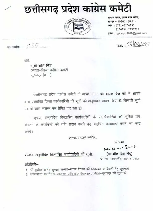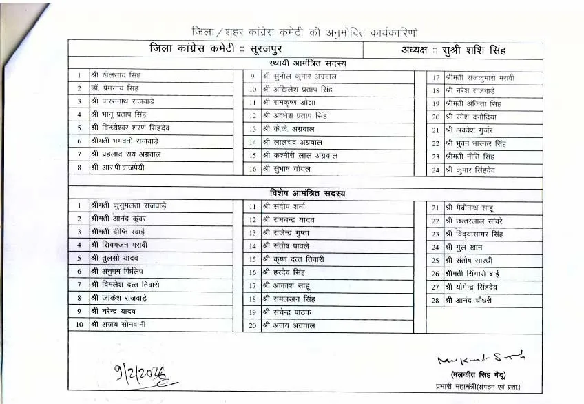 रायपुर। लंबे इंतजार के बाद कांग्रेस ने सूरजपुर जिला कार्यकारिणी की पहली सूची जारी कर दी है। सूची जारी होते ही जिले की राजनीति में हलचल तेज हो गई है और संगठन को नए सिरे से सक्रिय करने की कवायद शुरू हो गई है।