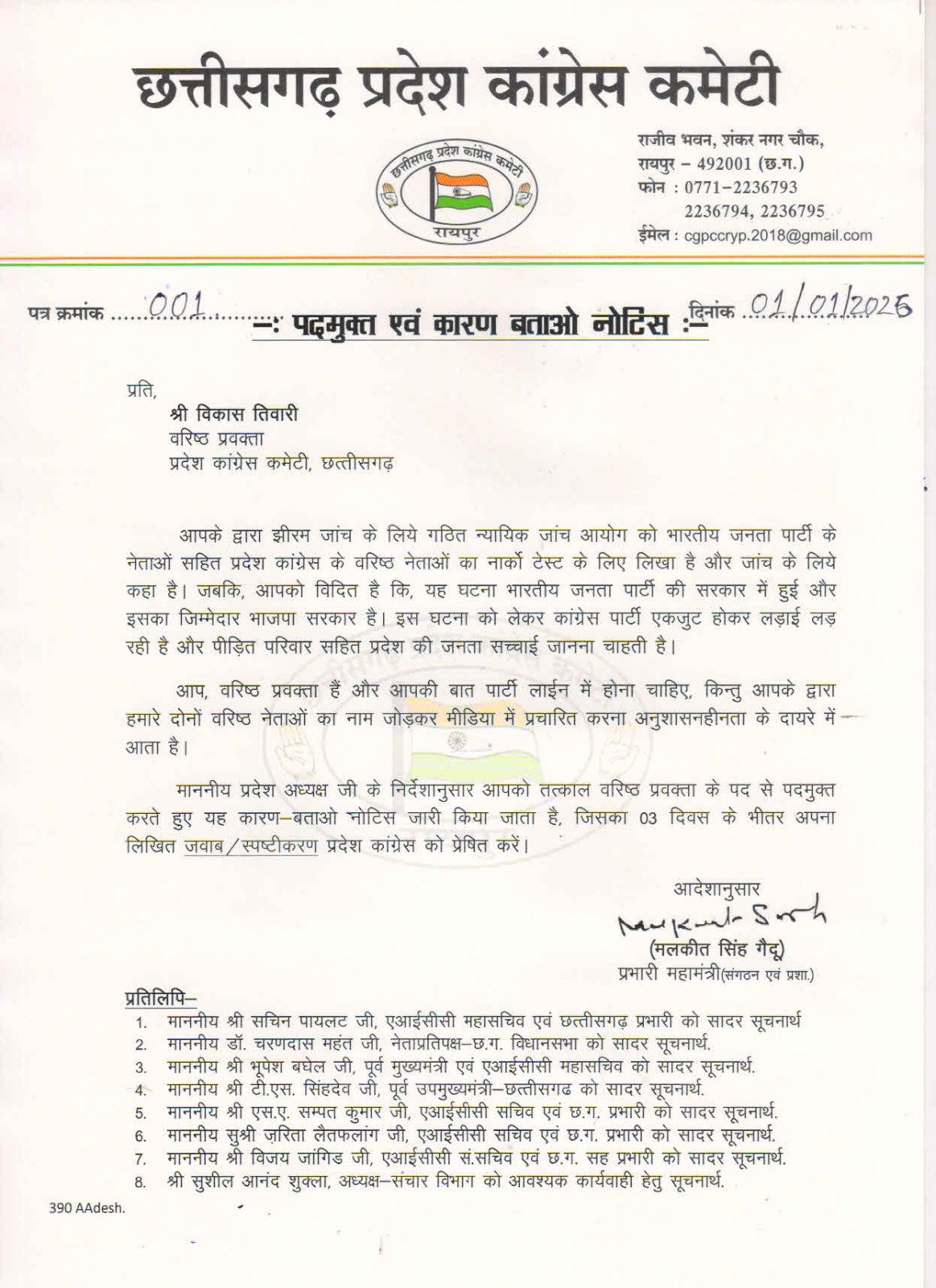 पीसीसी चीफ दीपक बैज के निर्देश पर पार्टी के प्रभारी महामंत्री मलकीत सिंह गैंदू ने आदेश जारी कर विकास तिवारी को प्रवक्ता पद से हटाते हुए कारण बताओ नोटिस थमाया है।